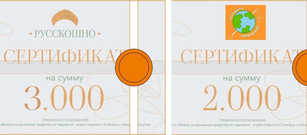 - Сертификаты на товары (Русскошно) — украшения, арома-камни, аксессуары. Подойдут для универсальных бизнес-подарков.
