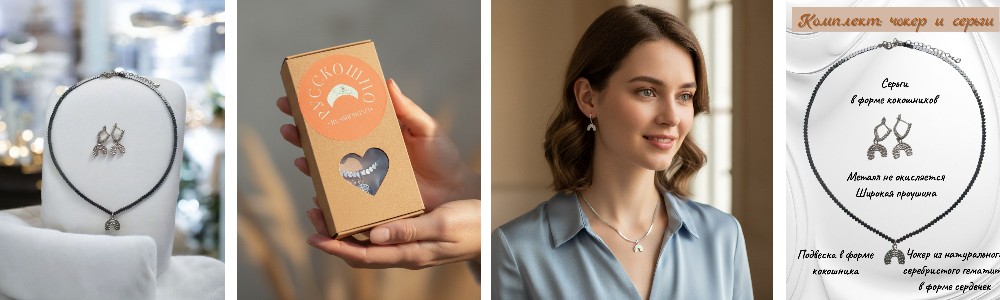 — Кокошники на серьгах и чокере создаются вручную, обеспечивая уникальность деталей и подчеркивая женскую индивидуальность.